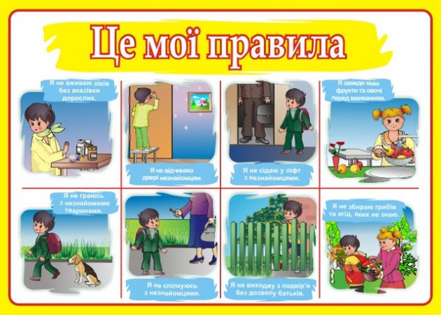 2) Не затримуйся на вулиці пізніше 22 години. 3) Категорично забороняється: контактувати з незнайомими людьми; ходити по будівництву; відвідувати водоймища без нагляду дорослих; розпалювати вогнища у лісі; їздити на велосипеді по проізджій частині дороги; вживати тютюн, алкоголь, наркотики; збирати незнайомі гриби та ягоди.